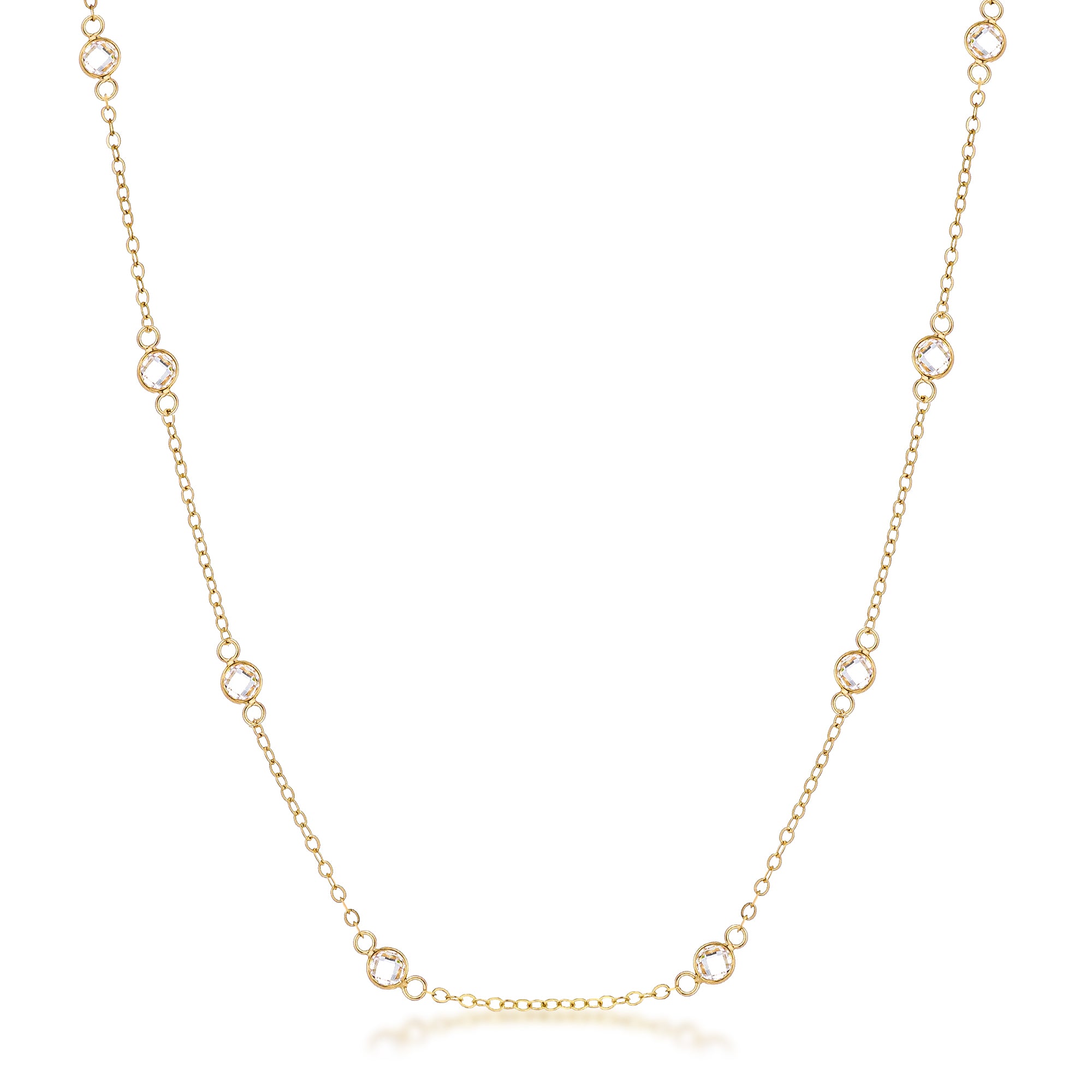 A polished and versatile chain, coated in classic Gold, defines daily elegance. Multiple spaced round bezeled clear Cubic Zirconia stones offers a muted touch of dainty femininity, ideal for completing an outfit with a dash of brilliance. A 2 inch extender offers its wearer options to add optional length to complement any neckline. A splash of gold adds an easy touch of old school glam.