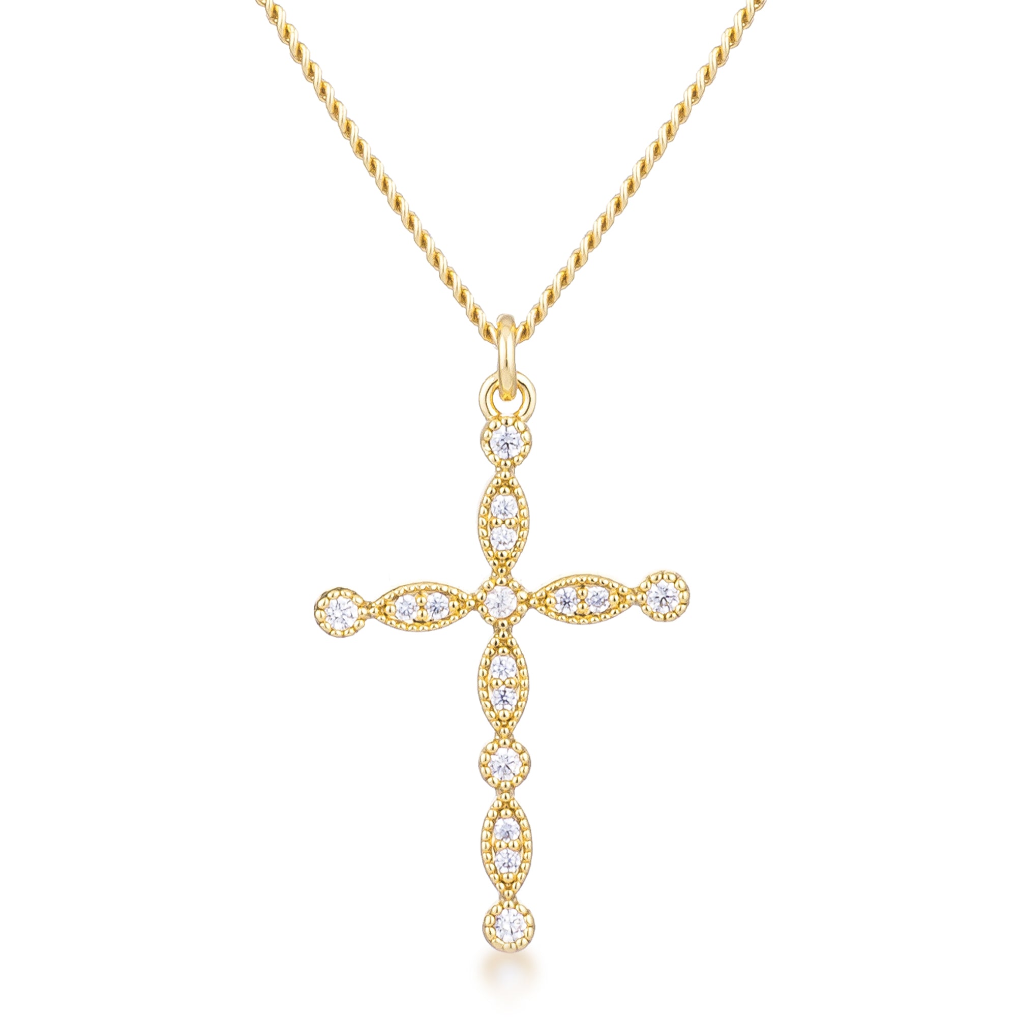 This cross pendant juxtaposes both the rounded and marquis shapes to create a unique touch of vintage and modern vibes. A gold plated finish keeps the piece classic and elegant. Sprinkled with delicate 1.25-2mm stones sitting on a 16" chain (with a flexible 2" extender), this piece offers just the perfect amount of shine for an everyday accessory.
