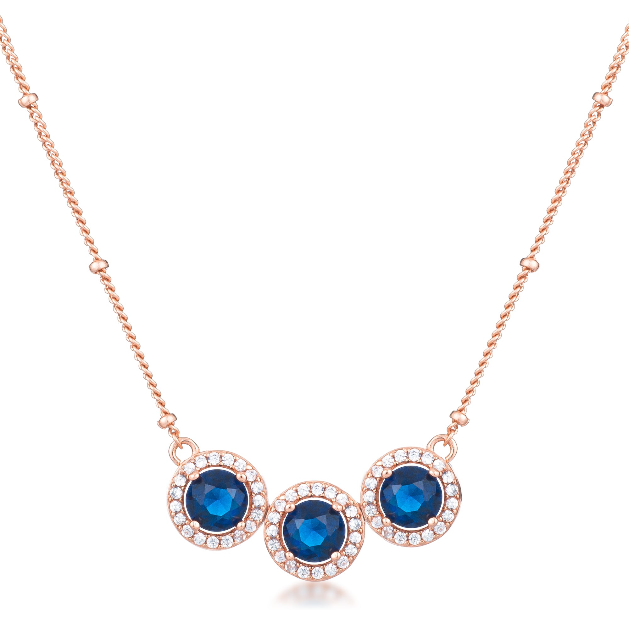 A combination of deep sapphire hues against a feminine Rose Gold plated halo setting melds to create modern day royalty vibes. Highlighting a trio cluster of Sapphire Blue CZ round cut stones sitting at its forefront, each stone hugged by a delicate halo of clear CZ stones, blends to create a splash of rich ocean against ones collarbones to create the ultimate image of royal class.