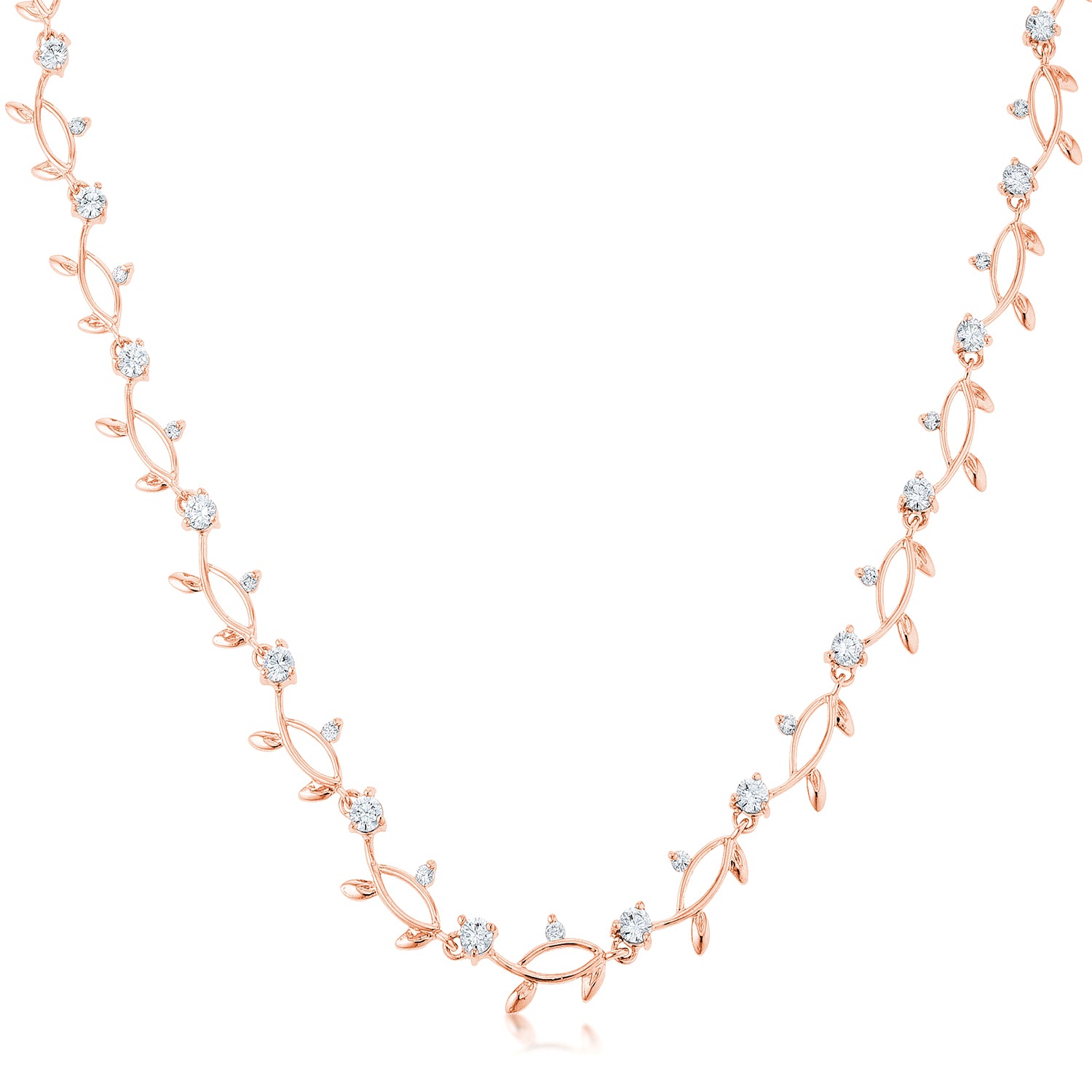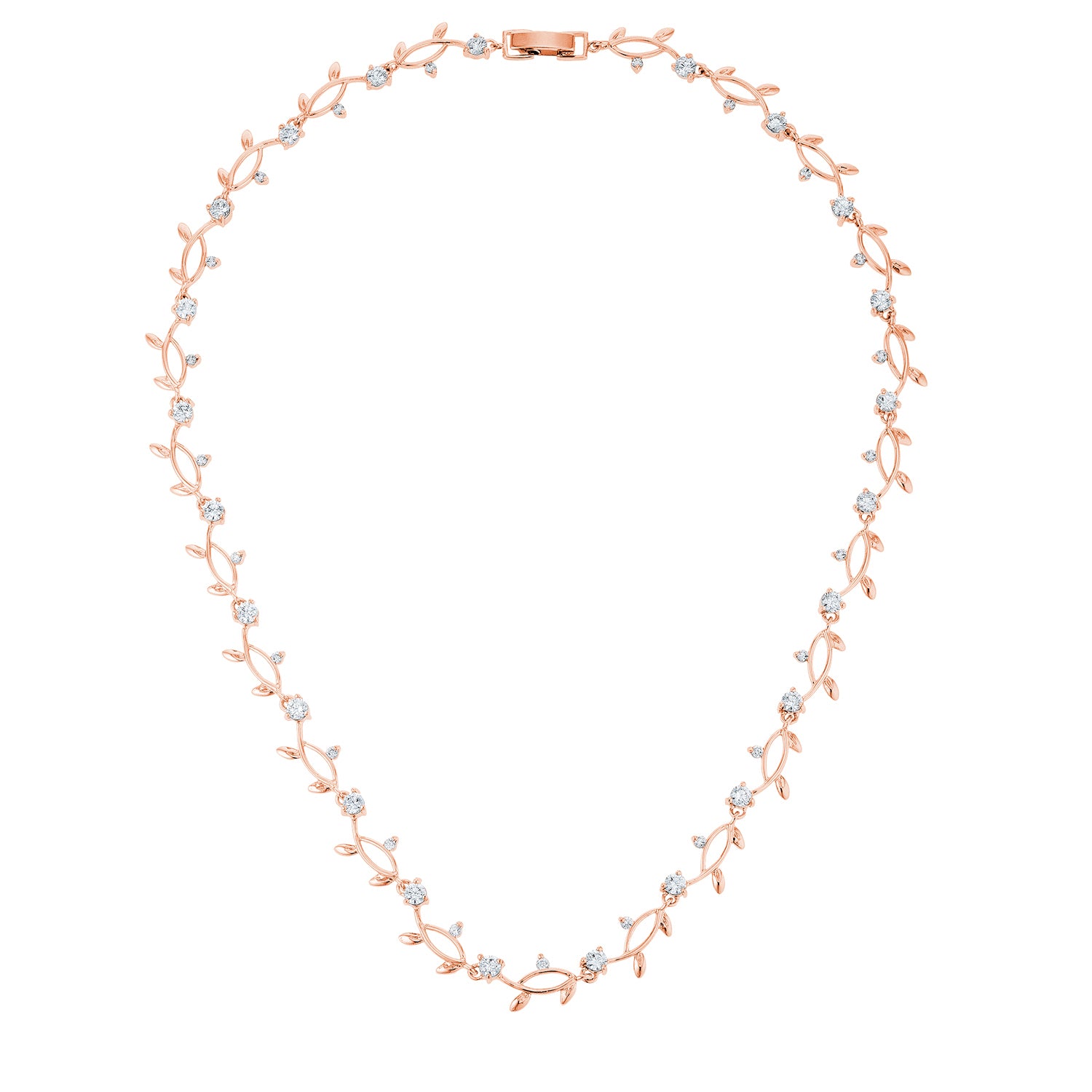 Add a touch of natural elegance with this feminine vine necklace. Plated with a warm pink 18k rose gold, this beautiful necklace sparkles for a timeless elegant look. It’s the perfect bridal necklace and adds effortless style to any formal evening ensemble.