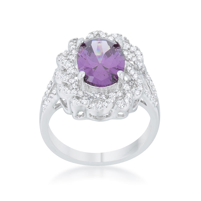 Clear, finely cut stones twist in an elegant design, accenting an amethyst center stone in this classic, 8.5 carat ring. Our genuine rhodium finish is achieved using an electroplating process that coats the item with heavy layers of rhodium, a close cousin to platinum. This gives our jewelry a platinum luster.