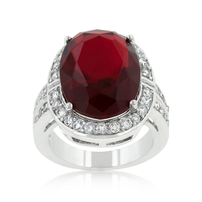Make a statement with our Ruby Red Cocktail Ring! Our genuine rhodium finish is achieved using an electroplating process that coats the item with heavy layers of rhodium, a close cousin to platinum, which gives our jewelry a platinum luster.
