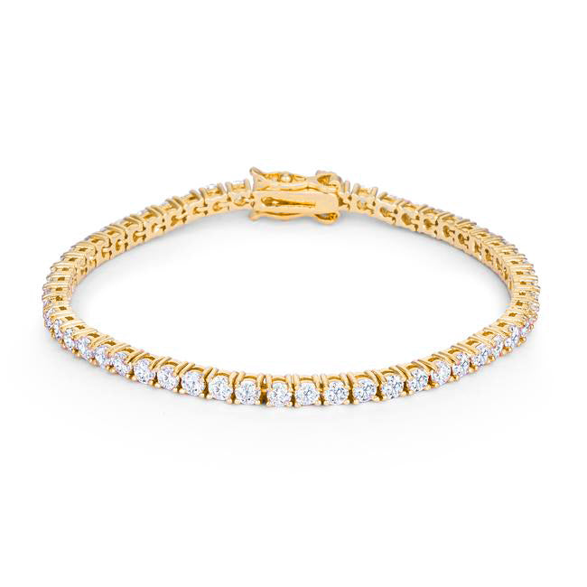 Reach for this tennis bracelet when layering on the shimmer. This piece promises a romantic and put-together finish. 18k plated gold is achieved using an electroplating process that coats the item with heavy layers of 18k Yellow Gold and color-treated to display a perfect 14k Hamilton gold color.